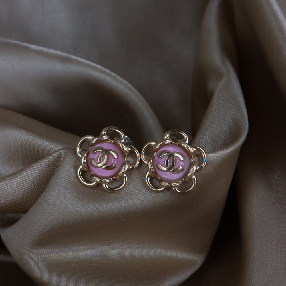 Chanel 復古粉紅琺瑯花朵耳環,花瓣以粉紅琺瑯填充,中央金屬雙 C Logo,金邊花瓣設計,甜美優雅。