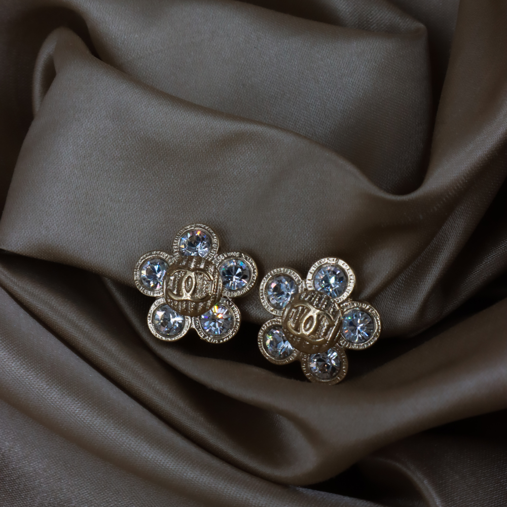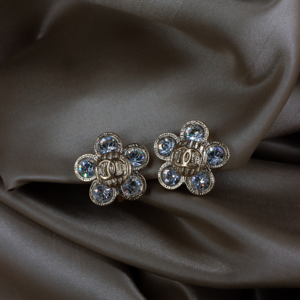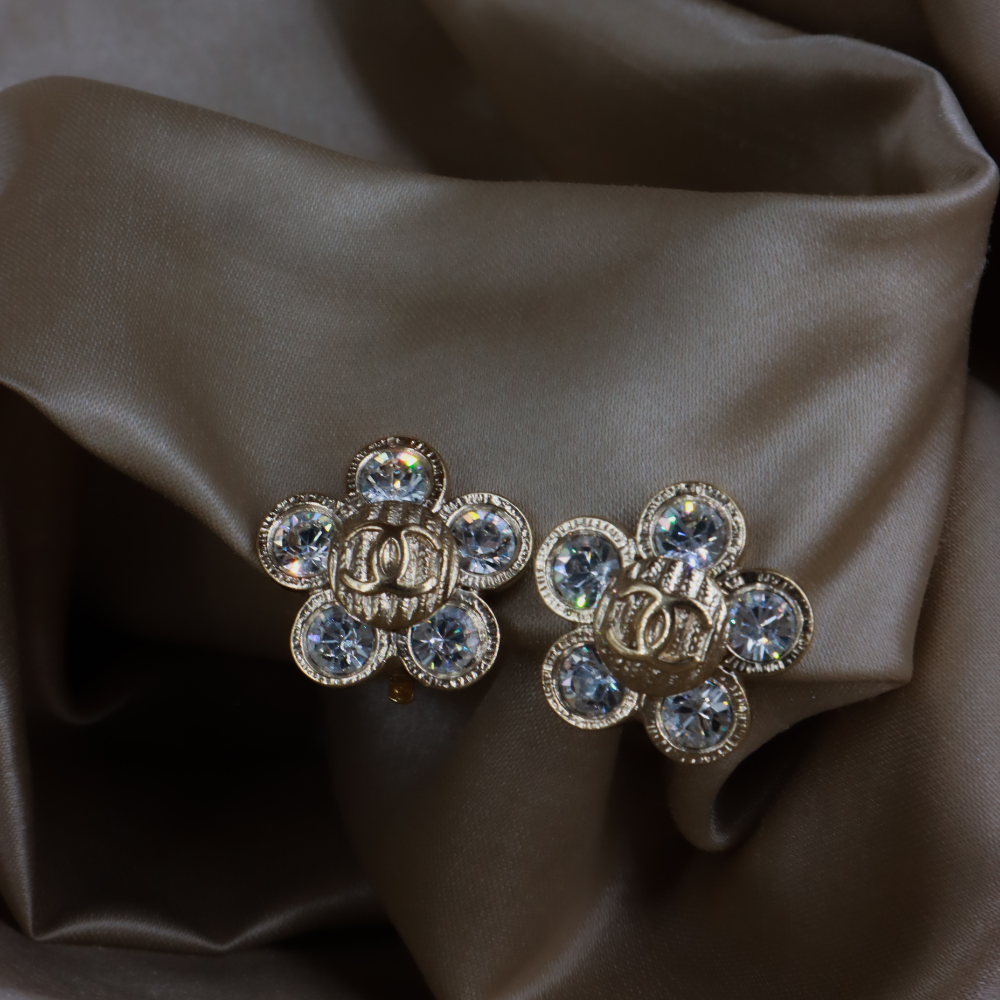 耳夾為 Chanel 復古花朵造型貼耳耳環,花瓣以銀色金屬打造,中心及花瓣鑲滿閃耀水鑽,Logo浮雕於花心