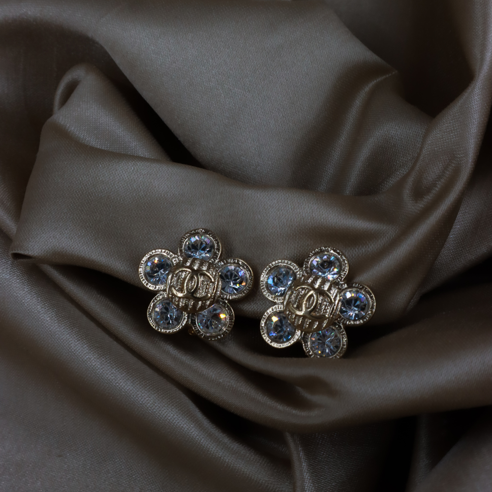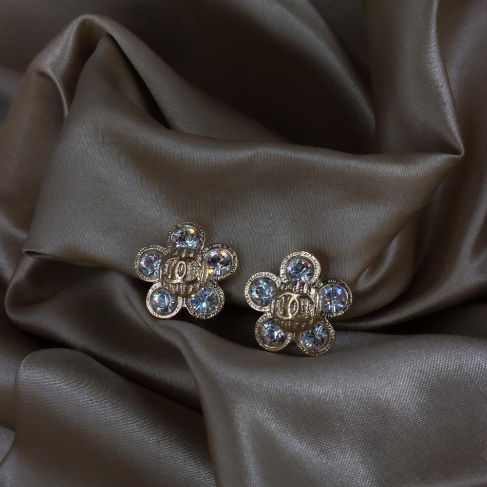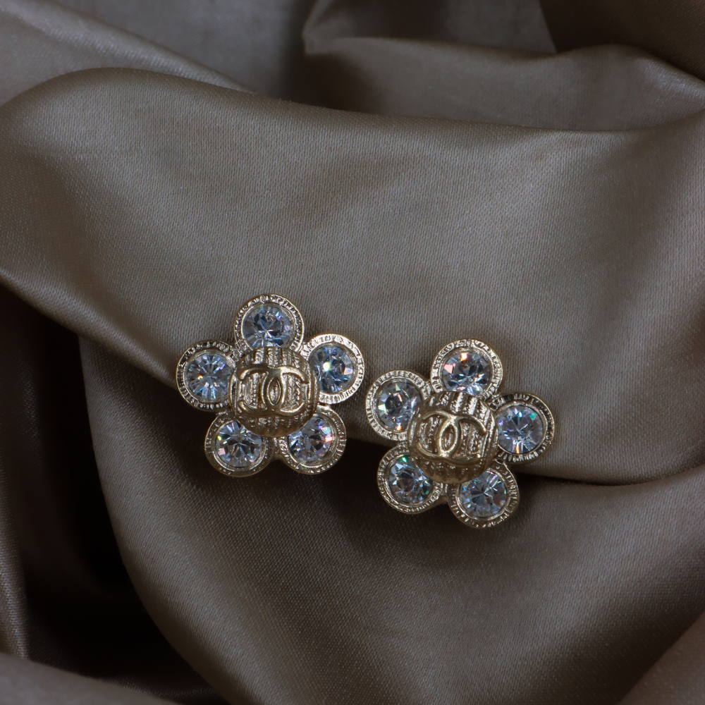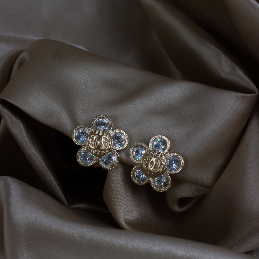 耳夾為 Chanel 復古花朵造型貼耳耳環,花瓣以銀色金屬打造,中心及花瓣鑲滿閃耀水鑽,Logo浮雕於花心