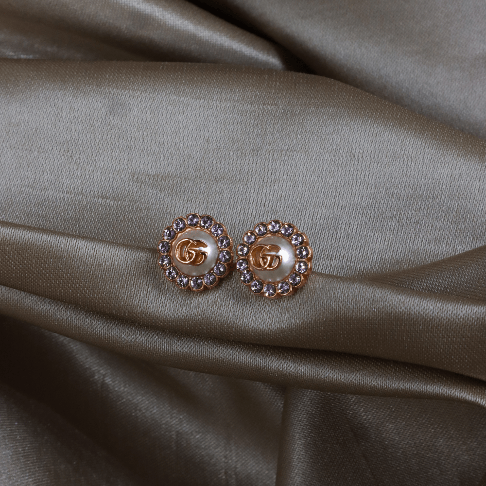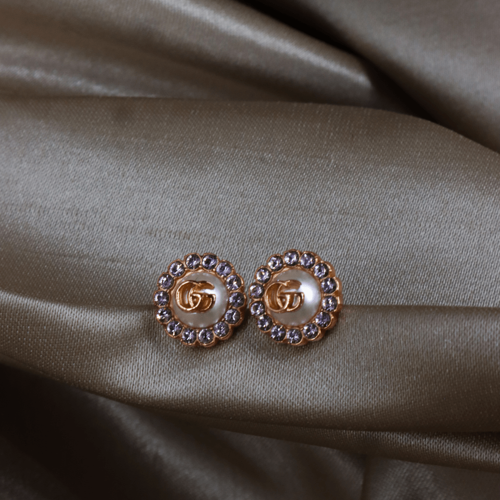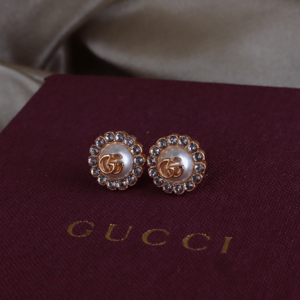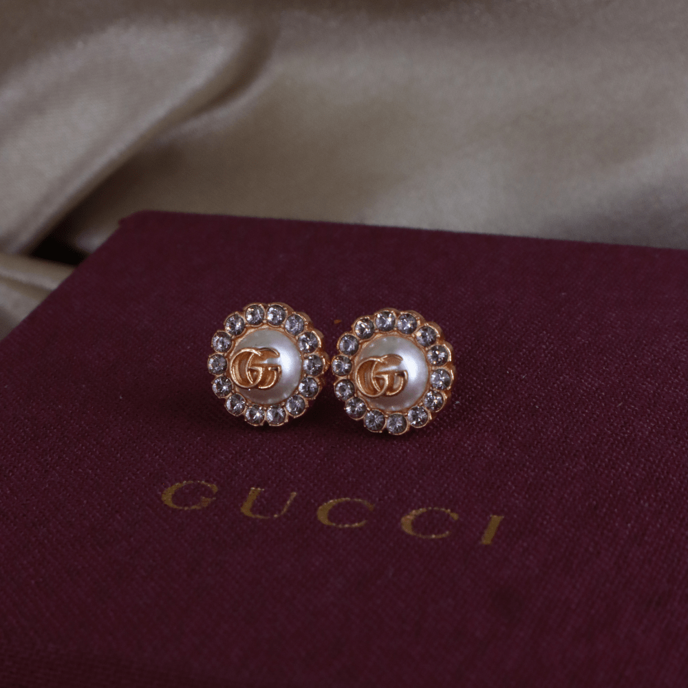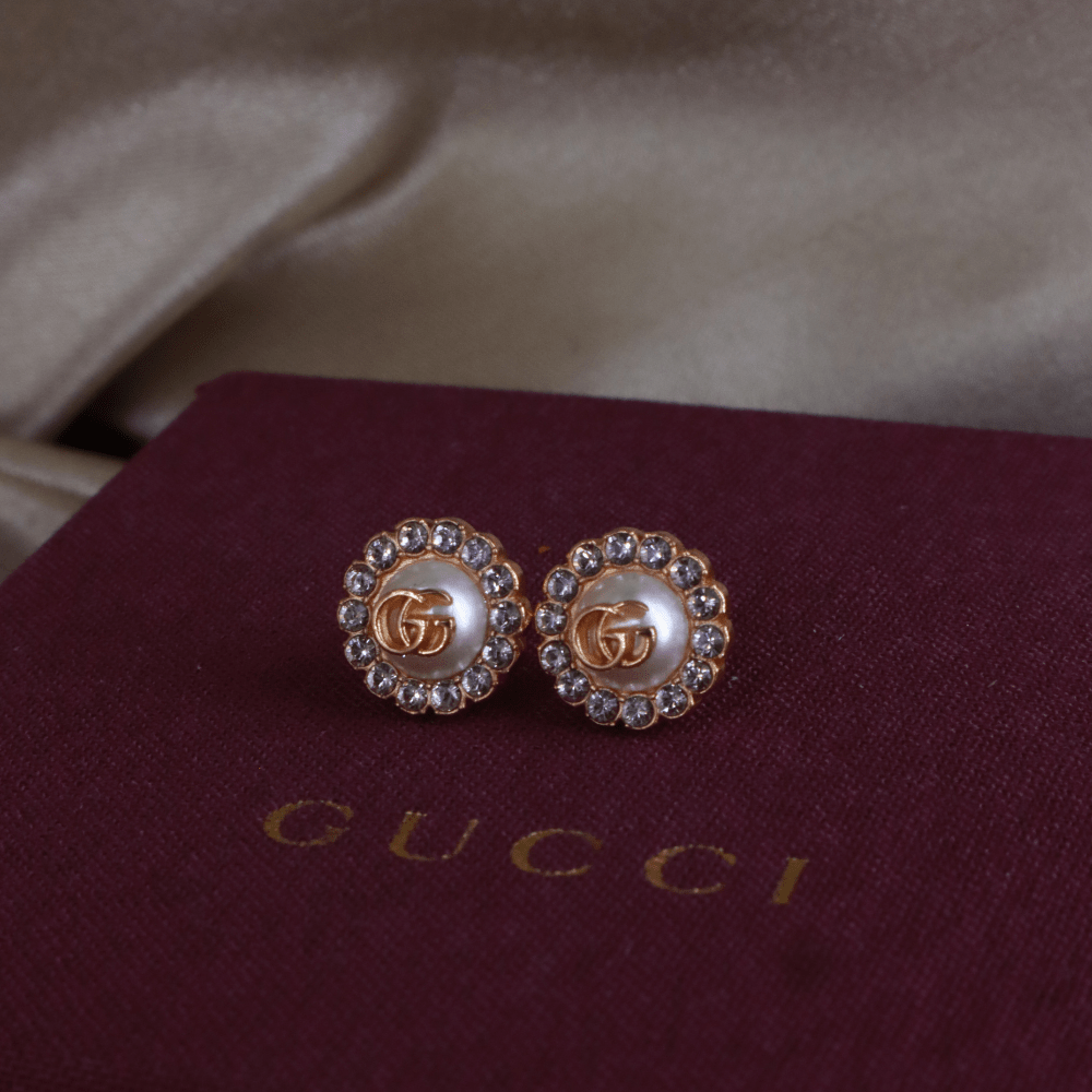 這款耳環以 Gucci 經典雙G標誌作為設計主軸,中央為立體珍珠元素,上面飾有GG logo,外圍一圈鑲嵌水鑽,整體結構清晰,呈現品牌標誌性細節。