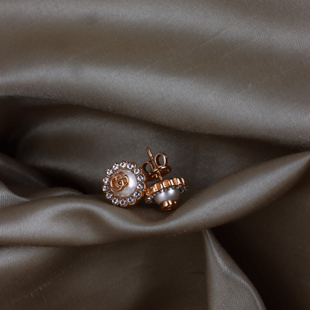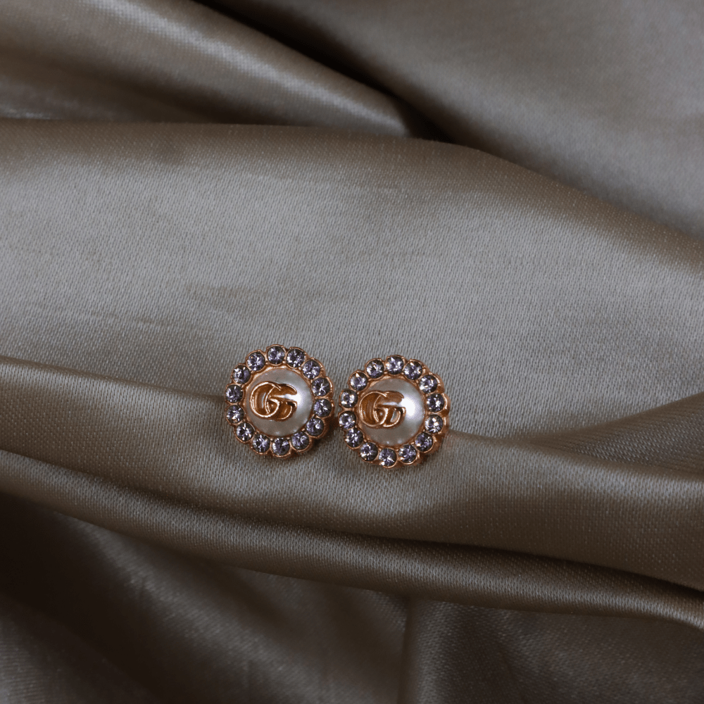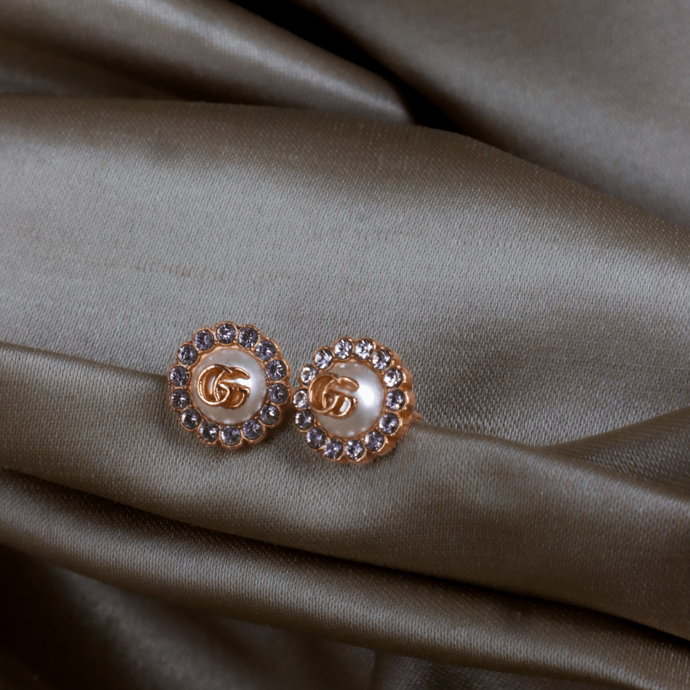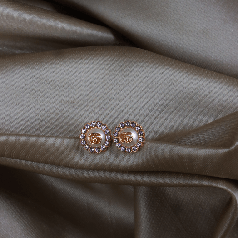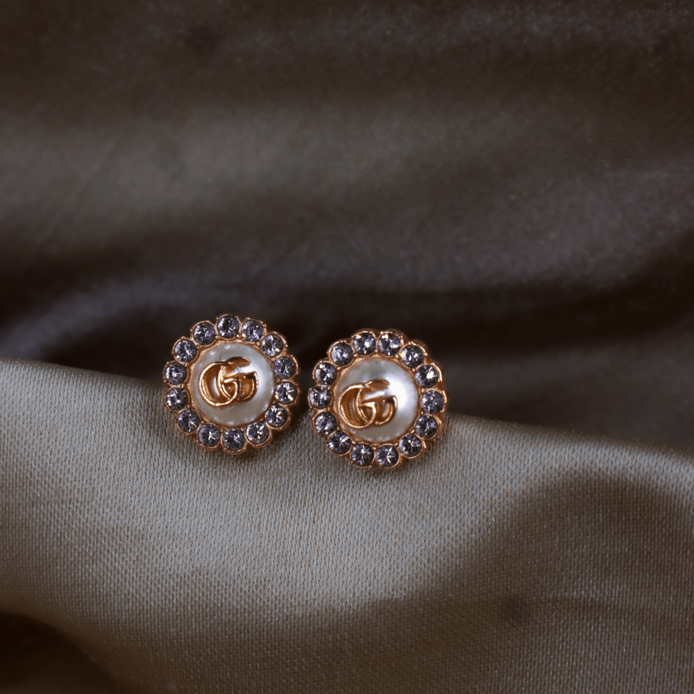 這款耳環以 Gucci 經典雙G標誌作為設計主軸,中央為立體珍珠元素,上面飾有GG logo,外圍一圈鑲嵌水鑽,整體結構清晰,呈現品牌標誌性細節。