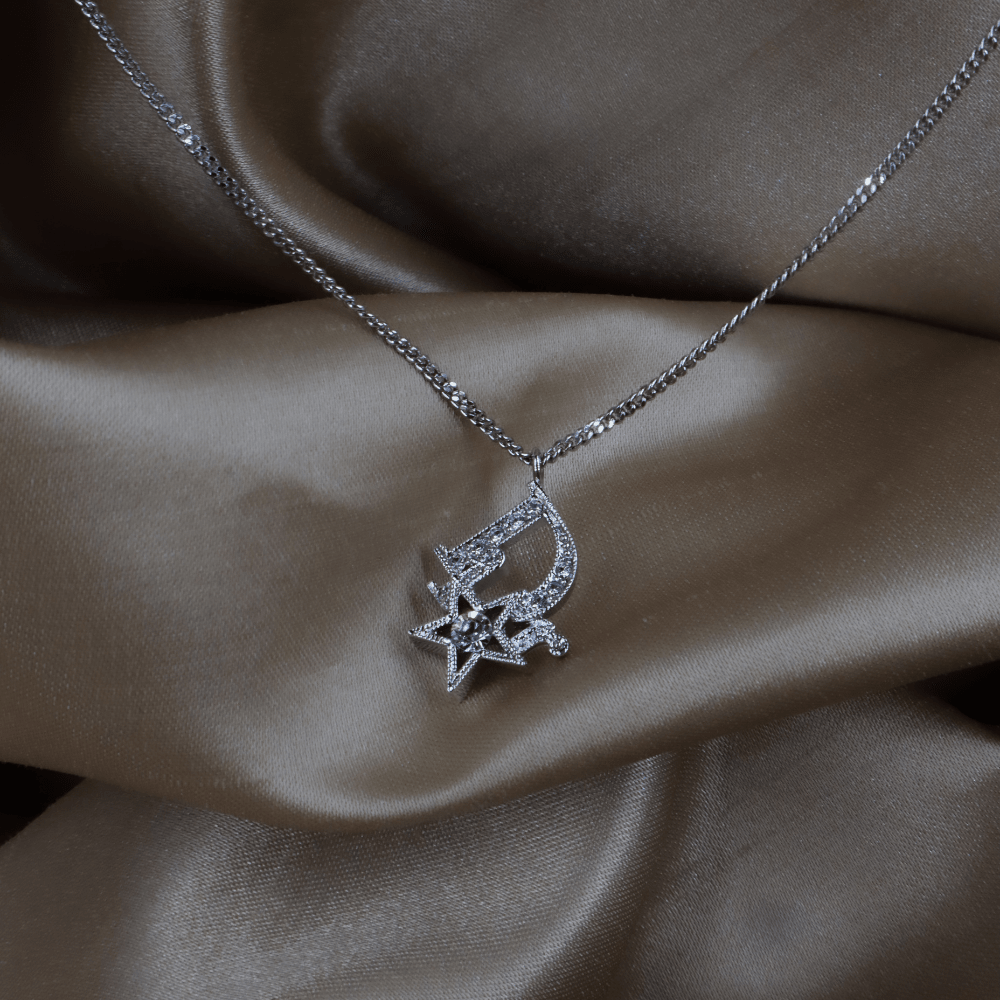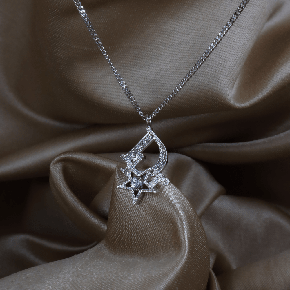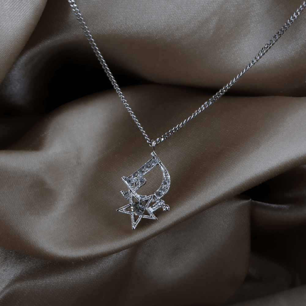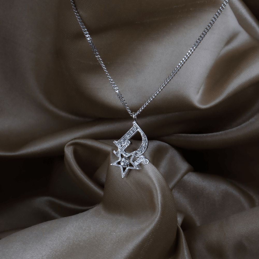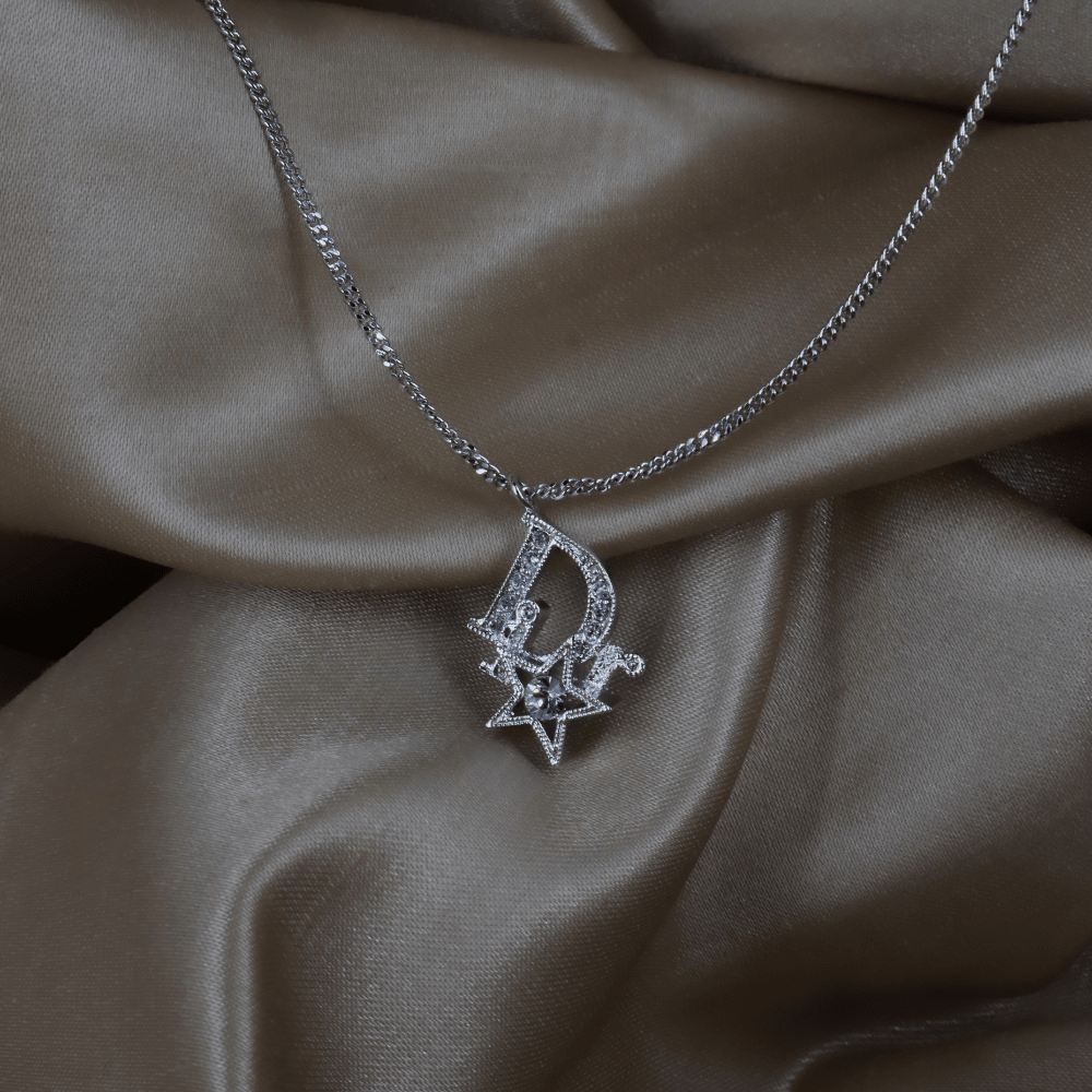 • 設計:銀色細鏈,吊墜為「Dior」字樣中「D」與小星星的組合,整體鋪鑲透明仿水晶,屬品牌常見的Logo+幸運星語彙;星星是Dior經典幸運符主題,現行與中古系列都大量出現。