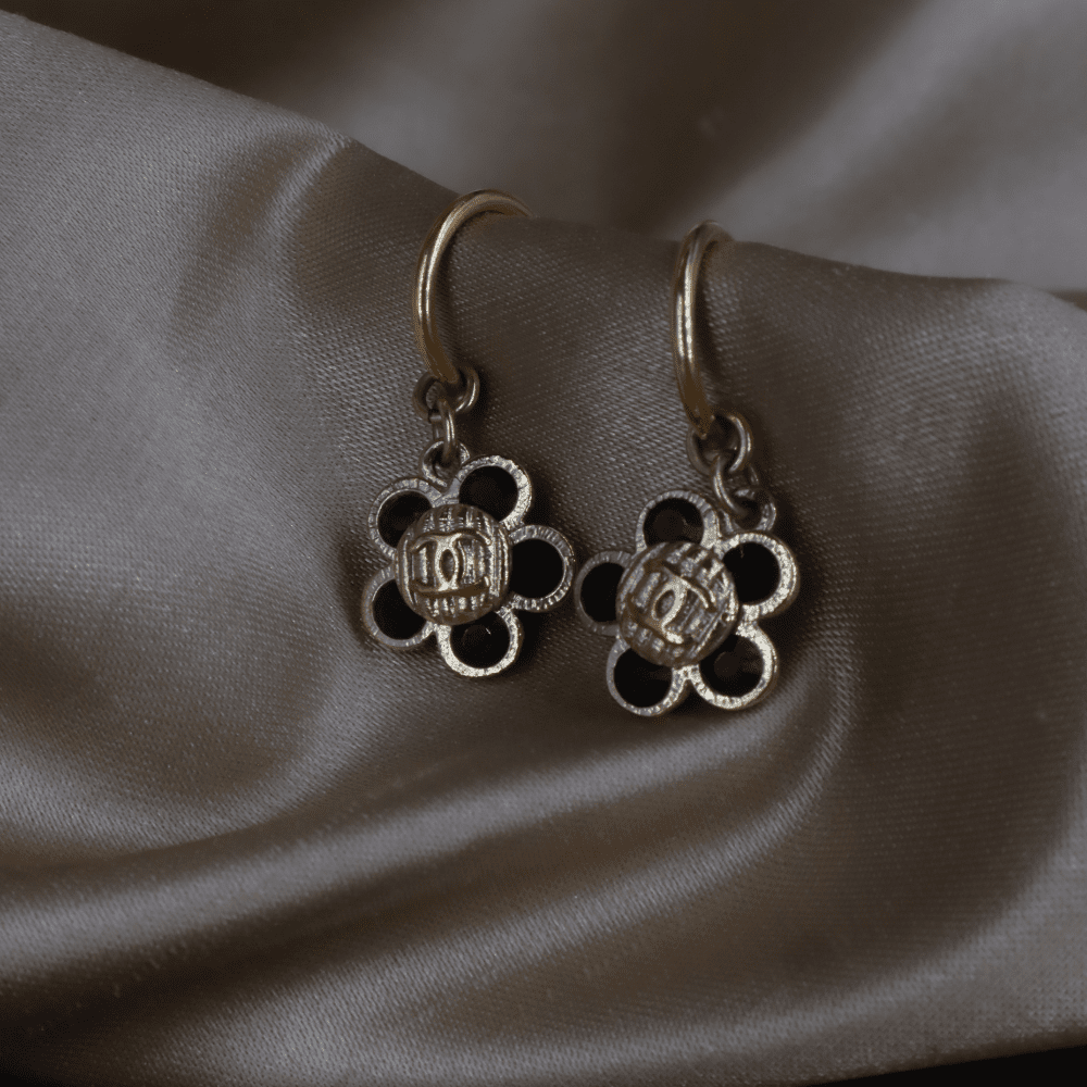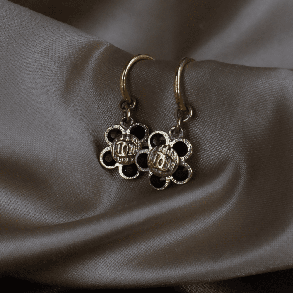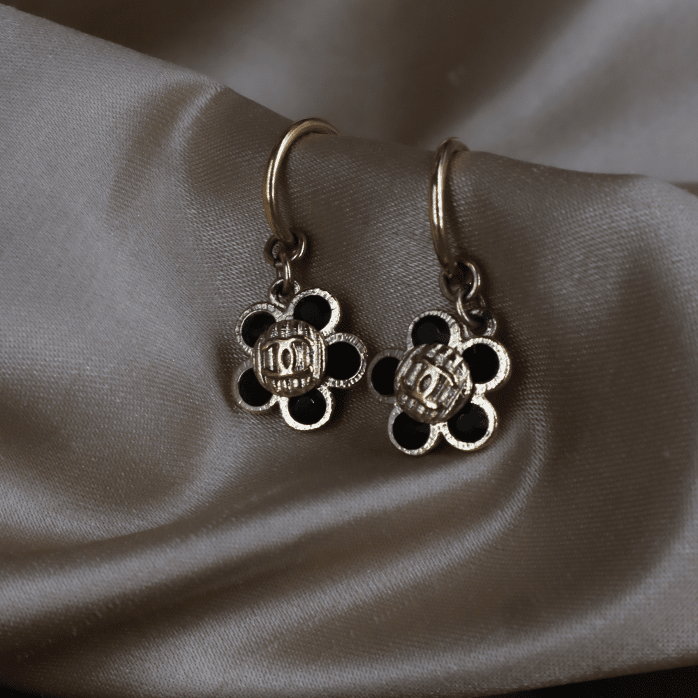 CHANEL 2006 黑色琺瑯花卉金色耳環 - Vintasy