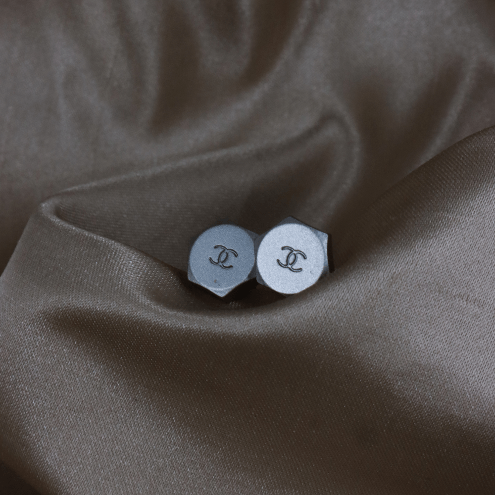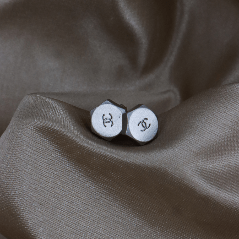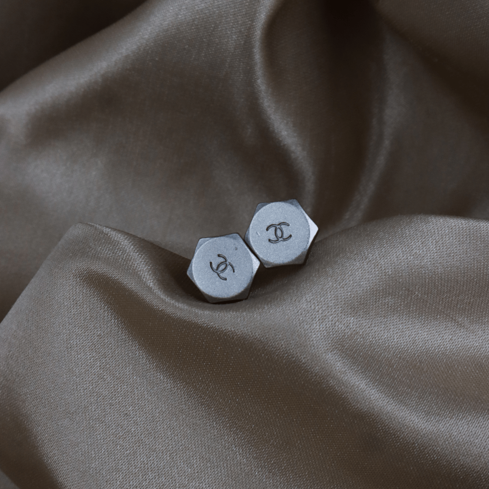 • 設計特徵:六角螺帽形狀(hexagon / bolt inspired),啞光銀色金屬表面,正面中央刻有經典雙C Coco Chanel logo,視覺上很像迷你金屬螺絲頭,屬Chanel較少見的酷感設計路線。