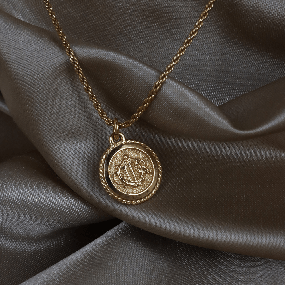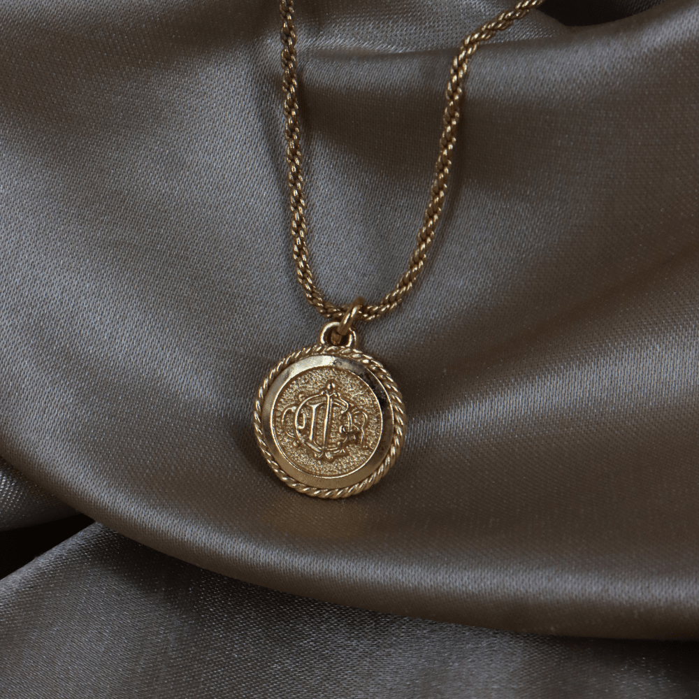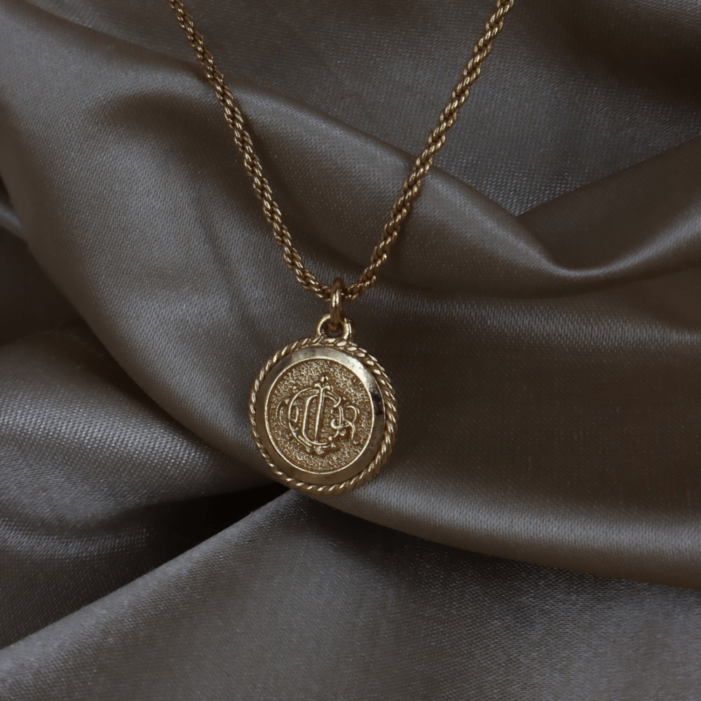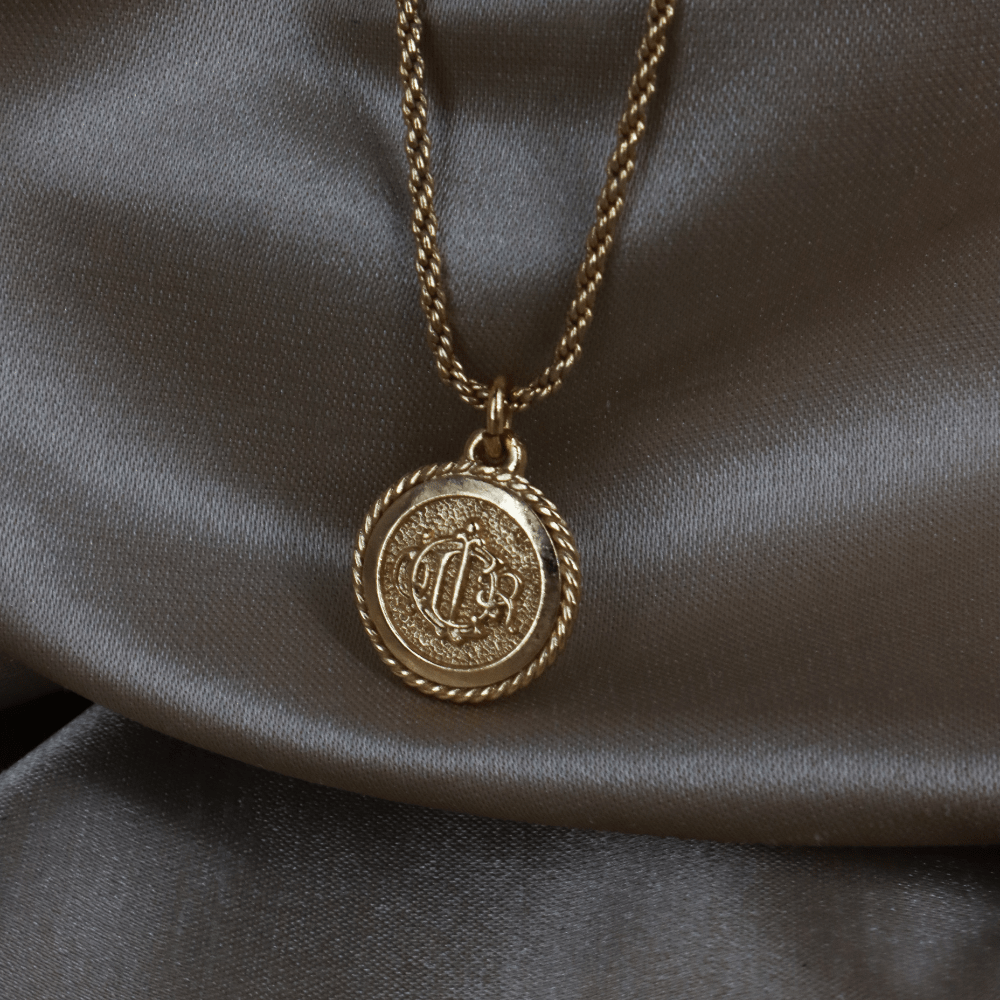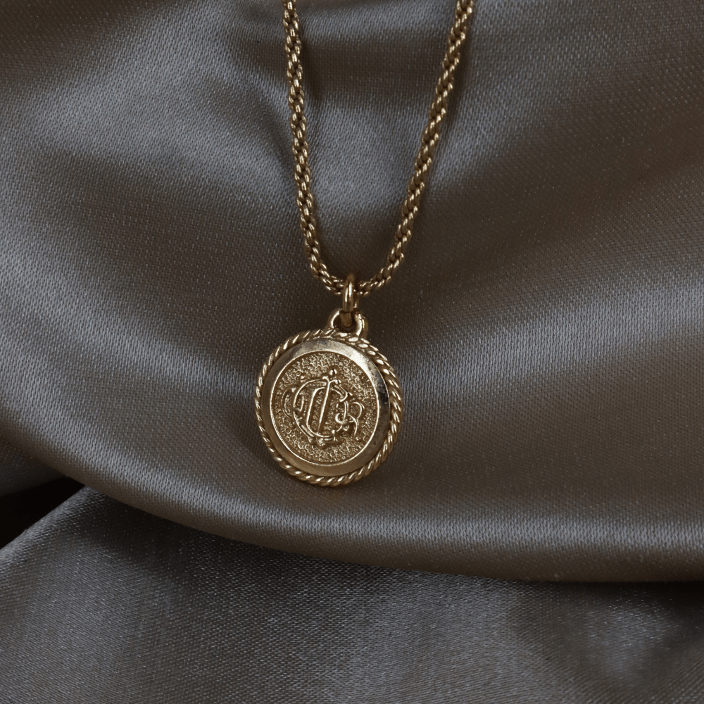 吊墜為金色圓章,中央裝飾立體CD字樣標誌,外圈以繩索花邊(rope edge)收邊,搭配金色扭繩鏈,是80-90年代Dior徽章珠寶語彙的代表。