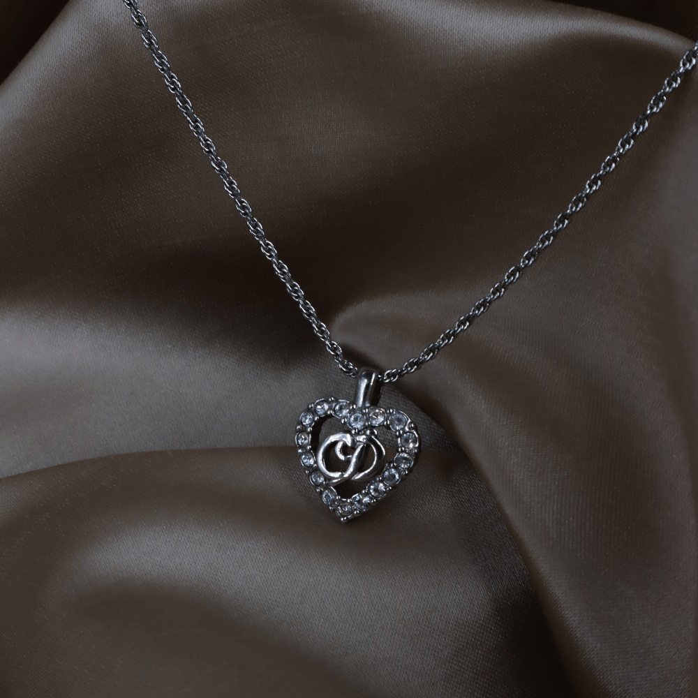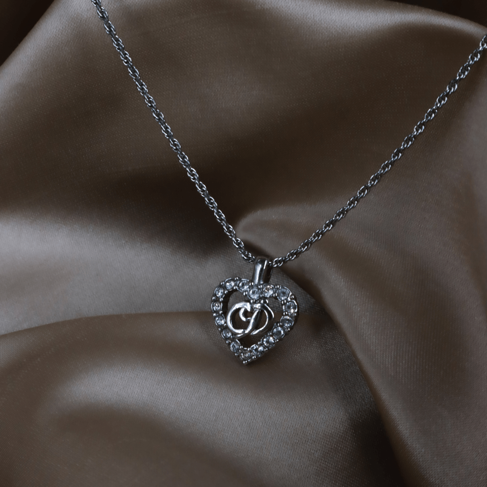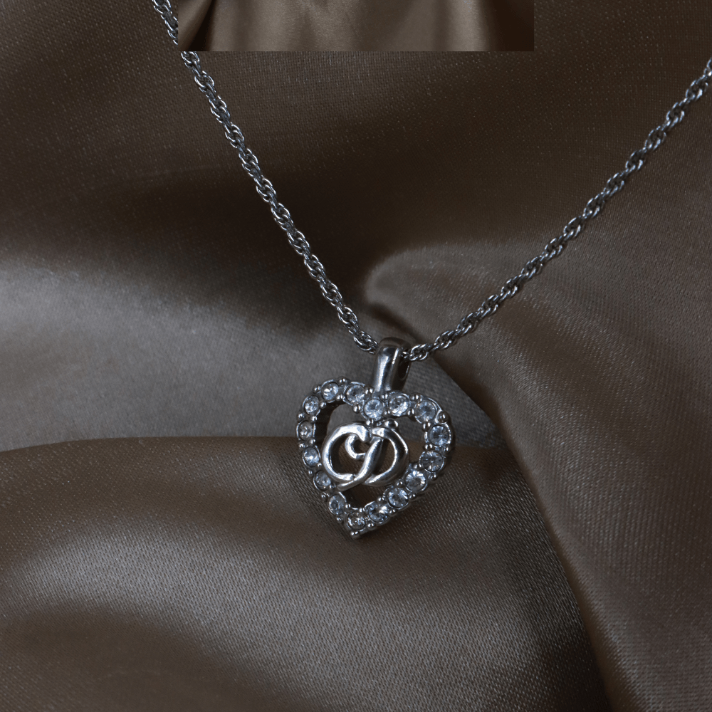 CHRISTIAN DIOR 銀色CD水晶心形吊墜頸鏈 - Vintasy
