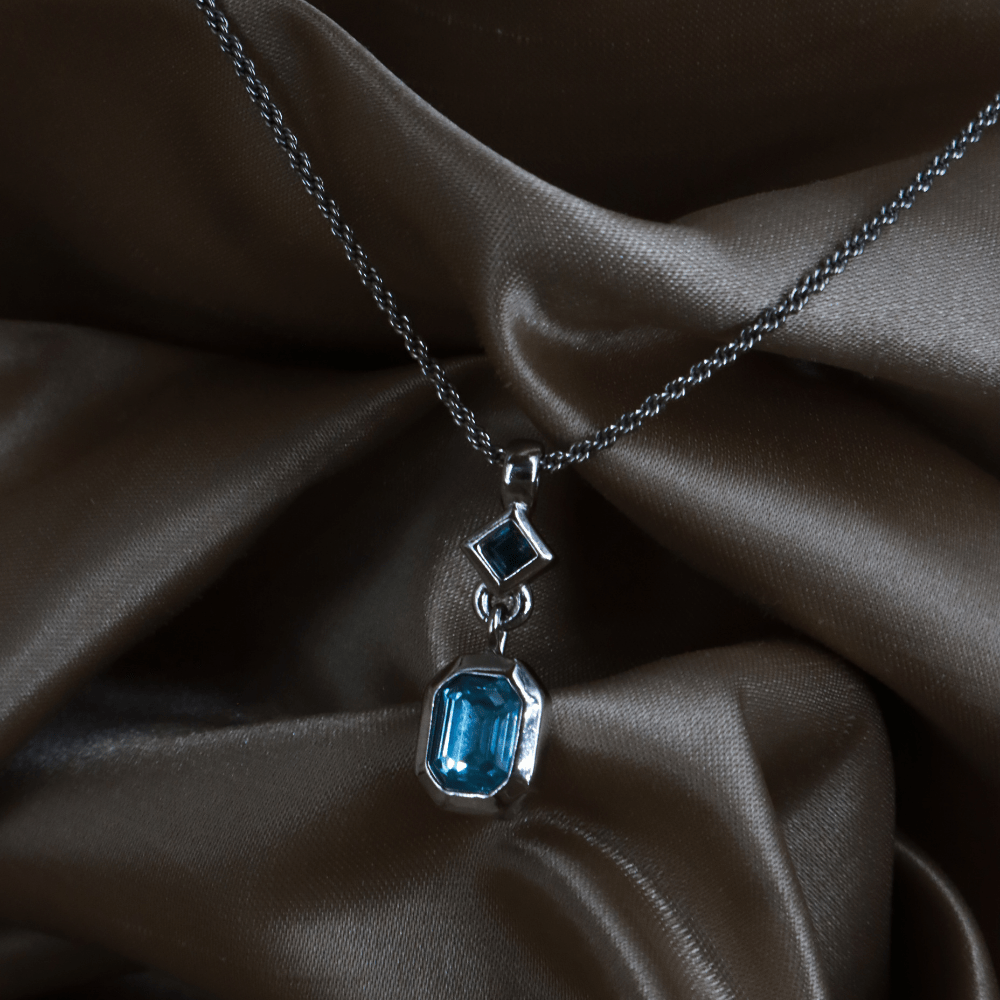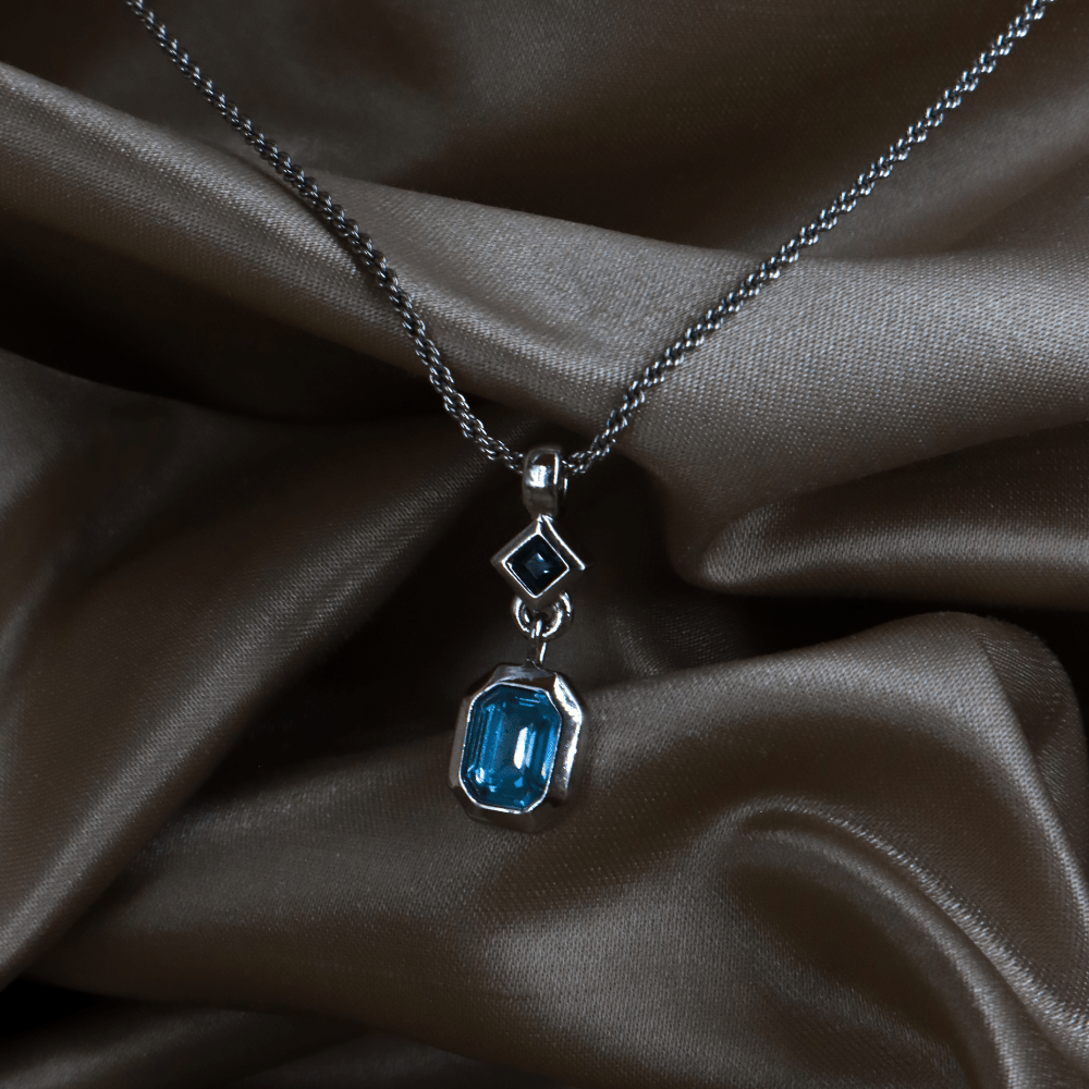 墜飾為幾何切割藍色仿寶石水晶,分為大八角形和小方形,層次分明。