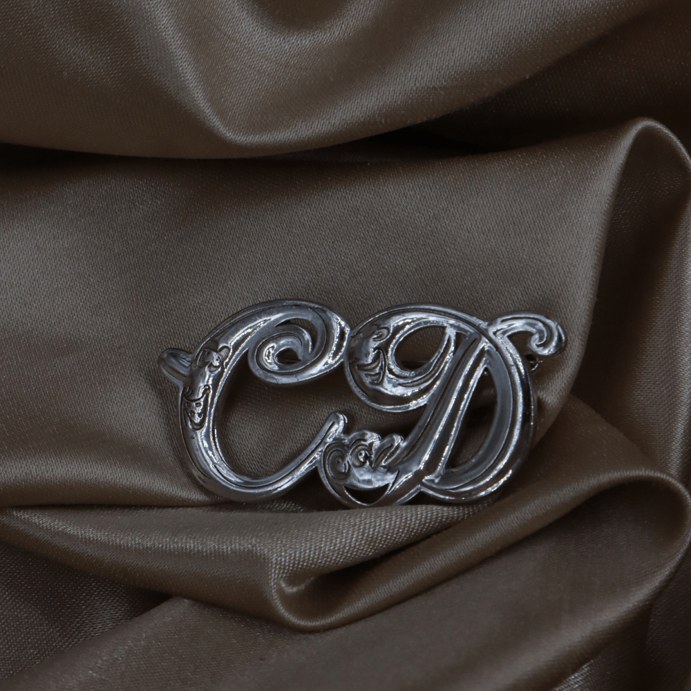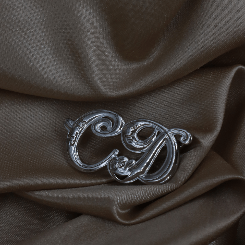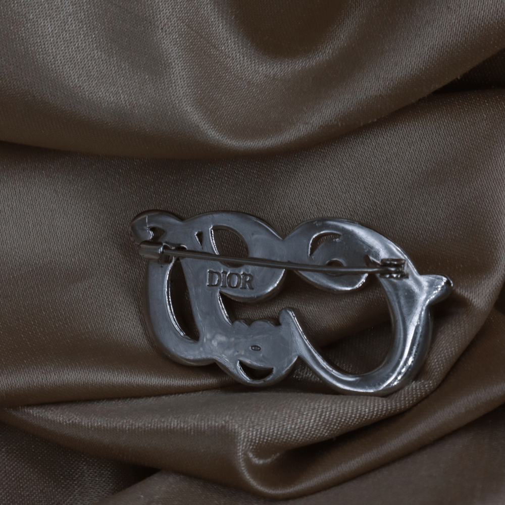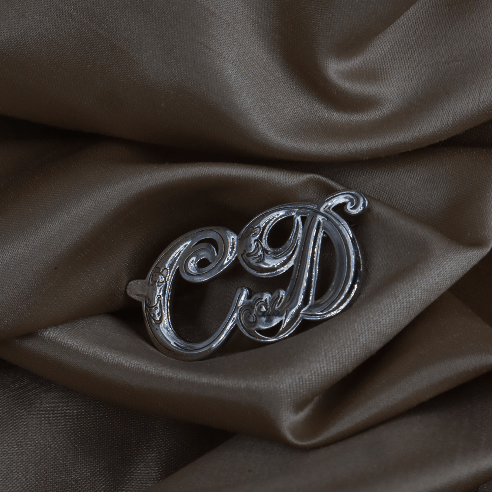 復古經典CD標誌銀色胸針(CD logo brooch),為品牌1980-2000年代最具辨識度的signature accessory之一,特點是以粗身捲草書(cursive scrollwork)立體構築「C」與「D」互扣字母,線條圓潤且帶有部分雕花裝飾,背面標有刻印「DIOR」,為正品特徵之一。