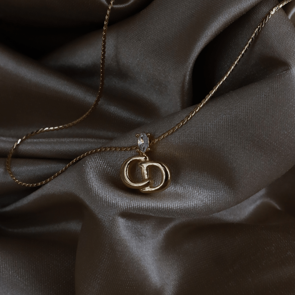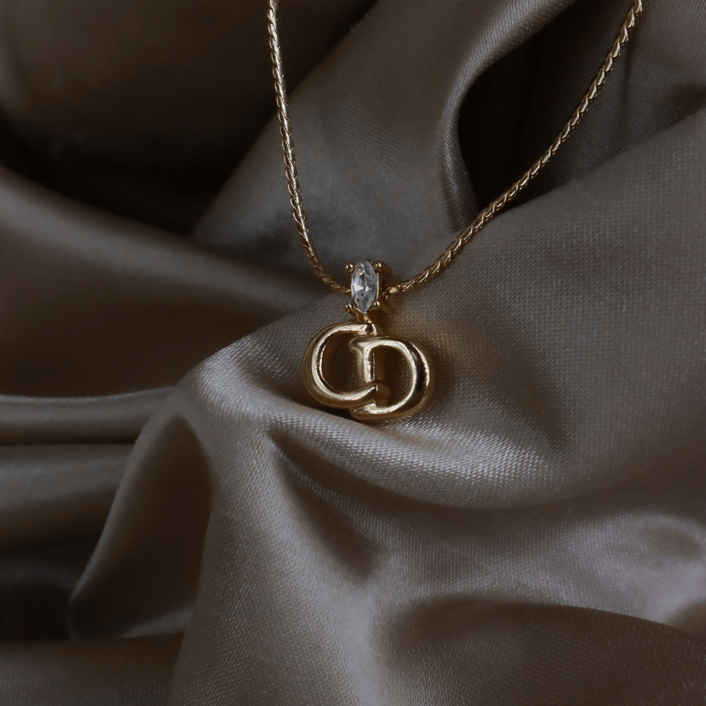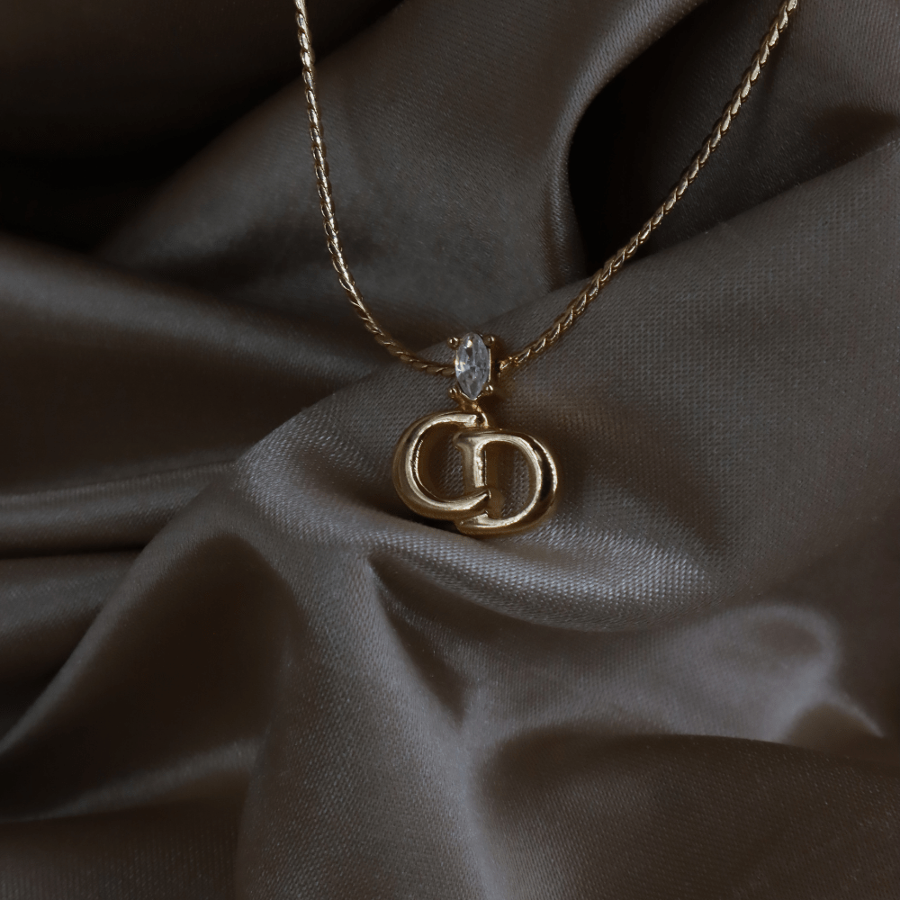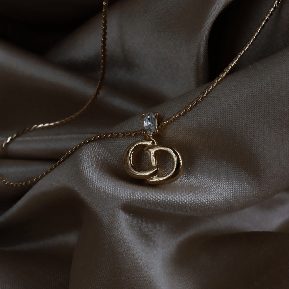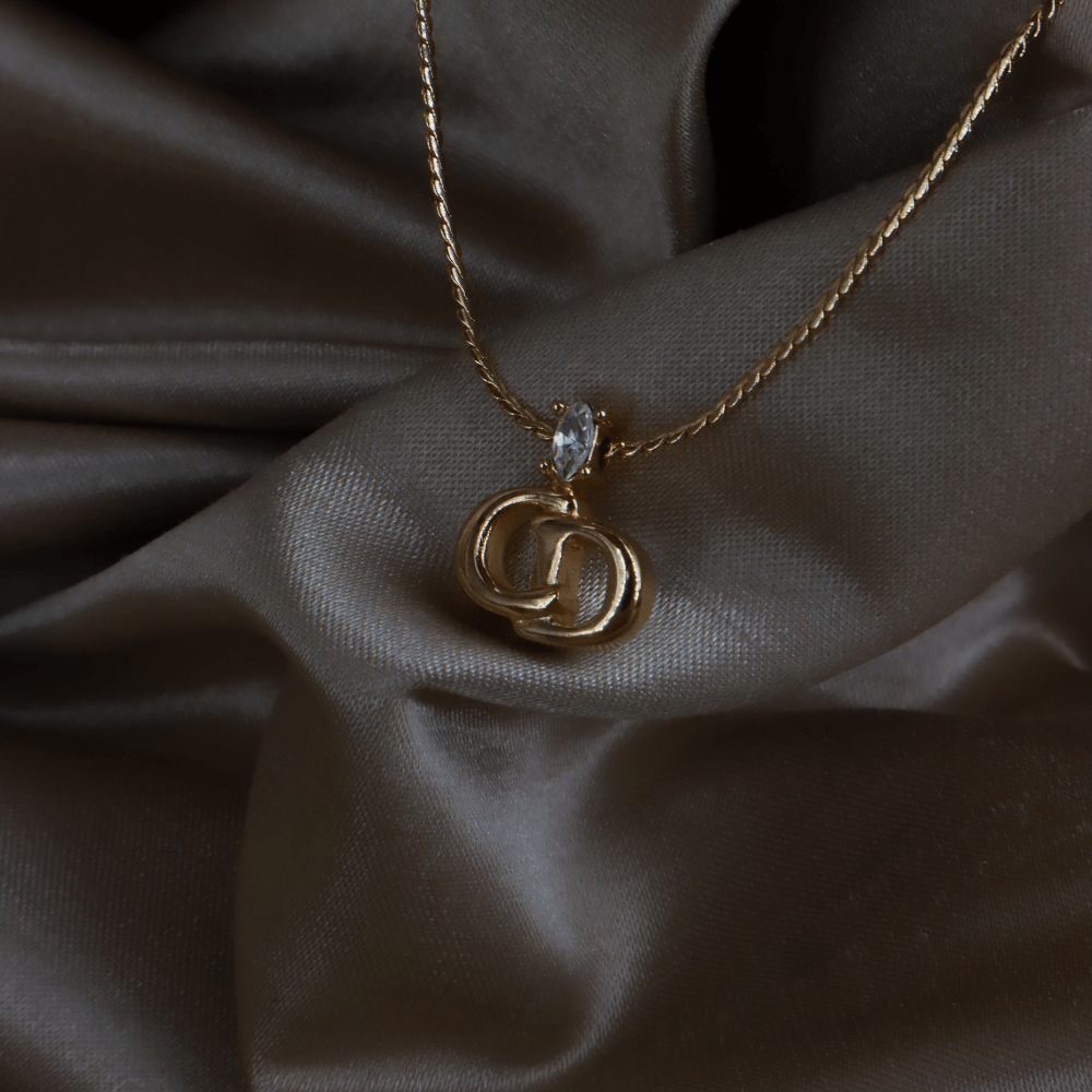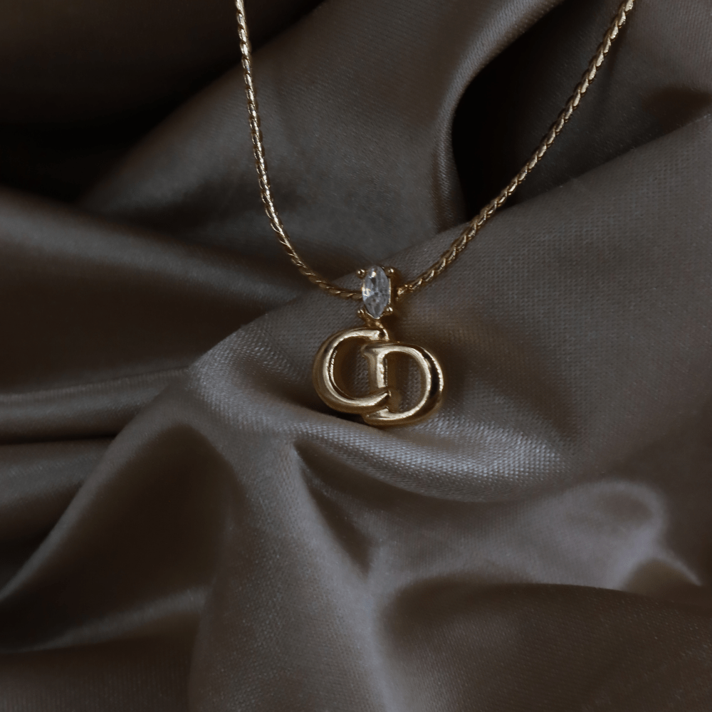 • 設計:金色扭繩鏈,中段吊墜為立體交疊「CD」Logo,下方以圓潤拋光呈現;吊環位置鑲有一顆橄欖形/貓眼形切割的透明水晶,增添復古華麗感,為Dior常見的Logo+單顆水晶點綴語彙。